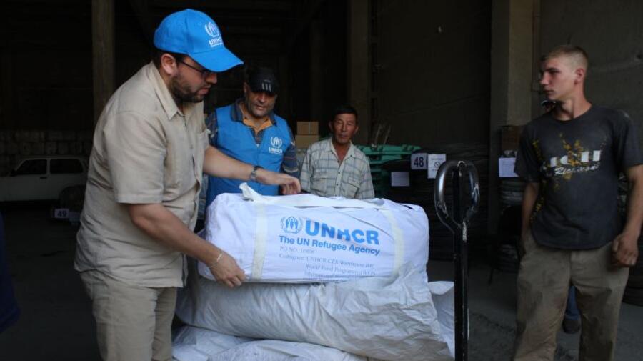 UNHCR staff prepare to distribute aid to those displaced by the earthquake.