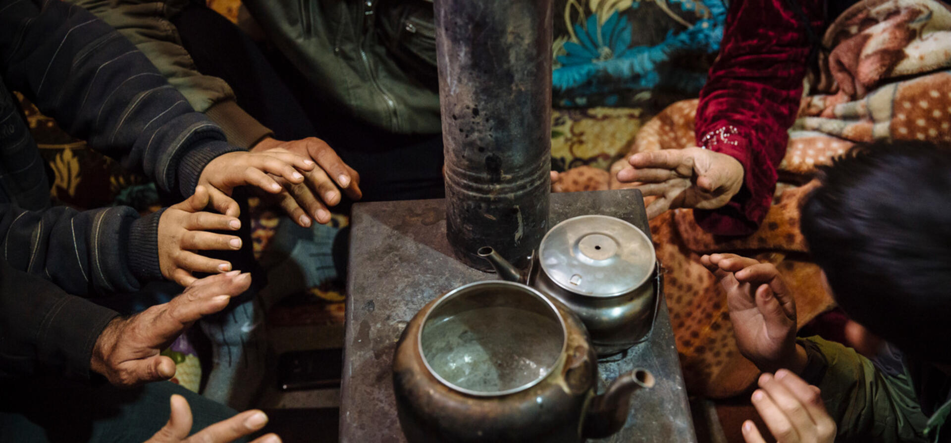 Syrian refugees Nazih, his wife Fatima and their children warm their hands next to a stove inside their shelter at an informal settlement near Terbol in the Bekaa Valley, Lebanon.