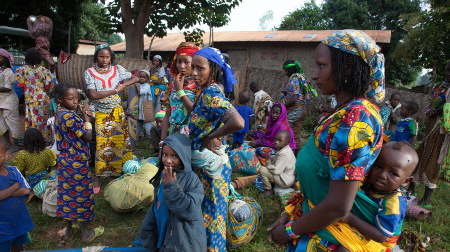 Colourfully dressed women and children arrive in Bossangoa after fleeing their homes. Living conditions are dire, but UNHCR and its partners are addressing the problem.