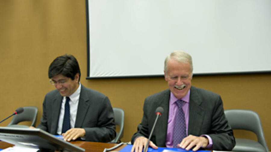 Deputy High Commissioner for Refugees L. Craig Johnstone talks to Ecuadorean Vice Foreign Minister José Valencia at the launch of the Global Needs Assessment report.