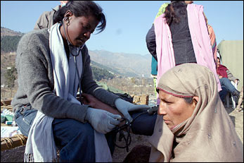 Today, the Best team has brought some Cuban doctors to Balakot's Lighthouse camp. A surprising number of women turn up for the check-up. Old women get their blood pressure measured and girls are treated for scabies. Pregnant women are referred to the Cuban mobile hospital at Bassian, which has an operating theatre and facilities for ultrasound diagnosis, X-ray, paediatrics, orthopaedics, gynaecology and internal medicine.