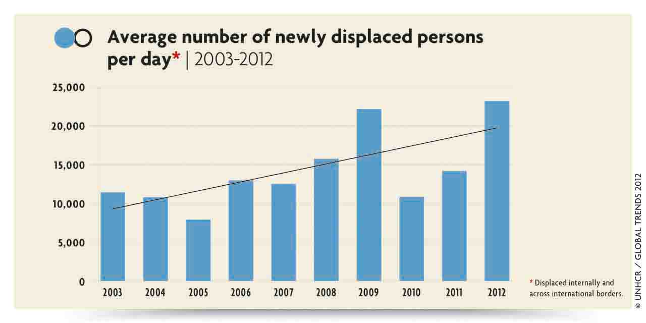 UNHCR's annual Global Trends report, which is based on data compiled by governments and non-governmental partner organizations, and from the organization's own records, shows 51.2 million people were forcibly displaced at the end of 2013, fully 6 million more than the 45.2 million reported in 2012.