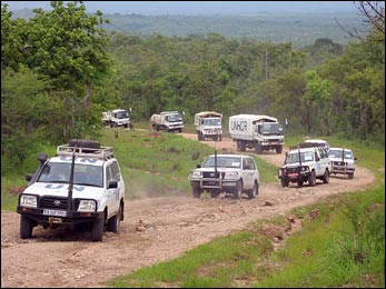 The UNHCR convoy crawls up a rough stretch of road near the border between Uganda and Sudan.