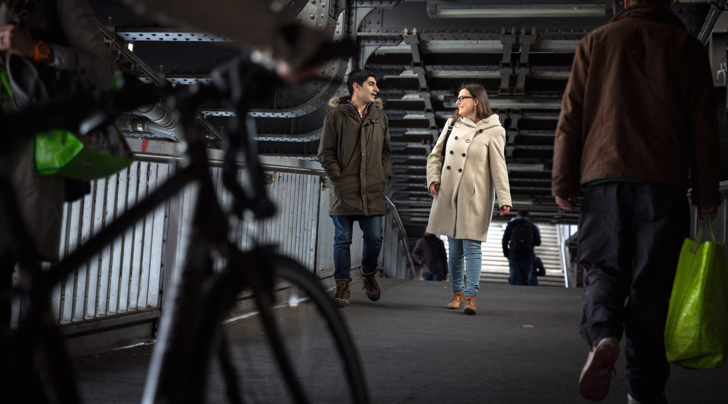 Fahed, a Syrian refugee, walks with a new German friend, Anne-Marie.