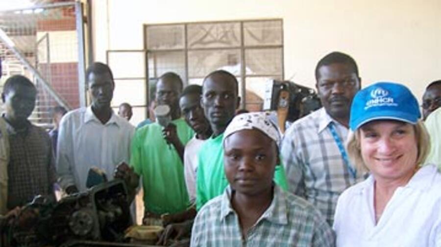 Deputy High Commissioner Wendy Chamberlin visits a training shop for refugee mechanics at Kakuma camp.
