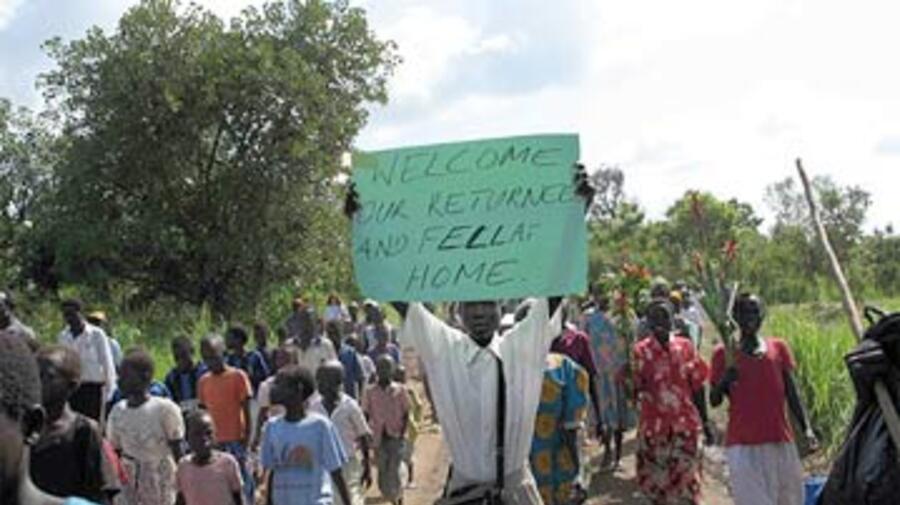 The first Sudanese refugees to return home from the Democratic Republic of the Congo get a warm welcome from one of their compatriots. A batch of 224 refugees were repatriated to southern Sudan by UNHCR convoy.