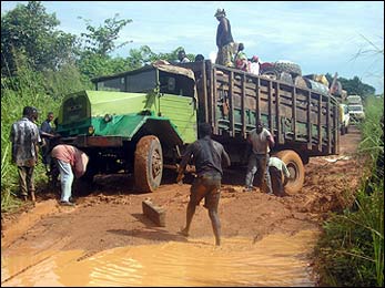 This truck carrying Congolese returnees is stuck on a road in the DRC province of Equateur.