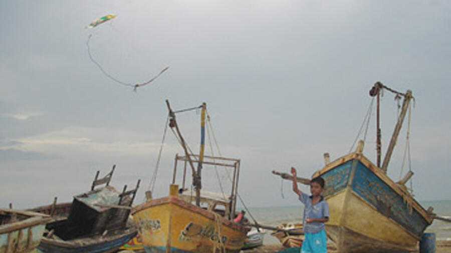 A boy flies his kite beside boats in the Mannar region of north-west Sri Lanka. UN agencies are helping local fishing cooperatives expand their markets as part of a wider effort to make people feel safer.