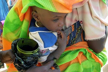 While they waited, aid workers scurried setting up an elaborate system to screen those eligible for the supplementary feeding - all children under five years old as well as pregnant and lactating women. A violent sand storm the previous afternoon had halted preparations, and now refugee women were frantically trying to make up for lost time, mixing the corn and soya blend with sugar and sunflower oil before putting it into plastic bags. The bags were then weighed to ensure that each child received 4.5 kg of the vitamin- and mineral-enhanced ration that will be renewed every two weeks.