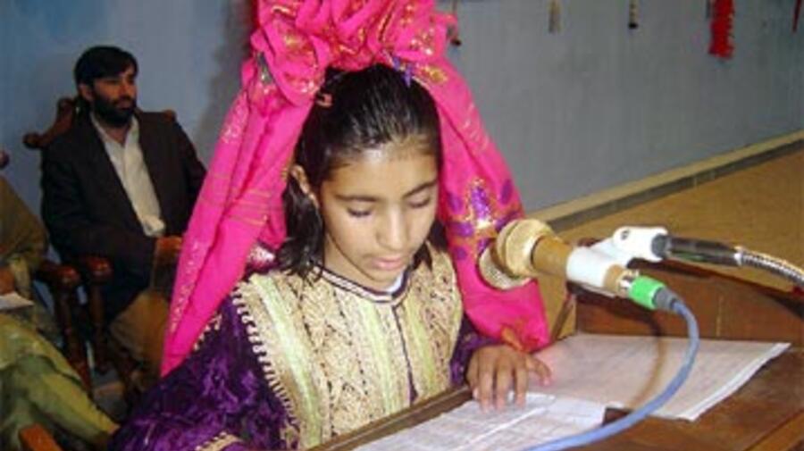Afghan refugee Shapozmi delivering her speech at the HIV/AIDS awareness cultural show at a Quetta drop-in centre.