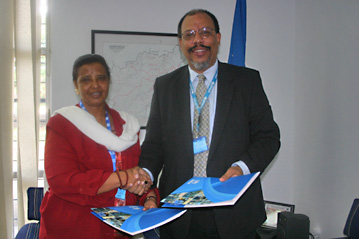 UNHCR's Guenet Guebre-Christos (left) and UNICEF's Martin Mogwanja after signing the MoU on vaccine procurement.