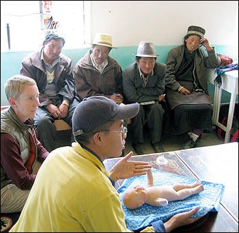 Former Vietnamese refugee Tran Nguyen Toan (in yellow) helping rural and nomadic populations in Tibet to improve traditional childbirth practices.