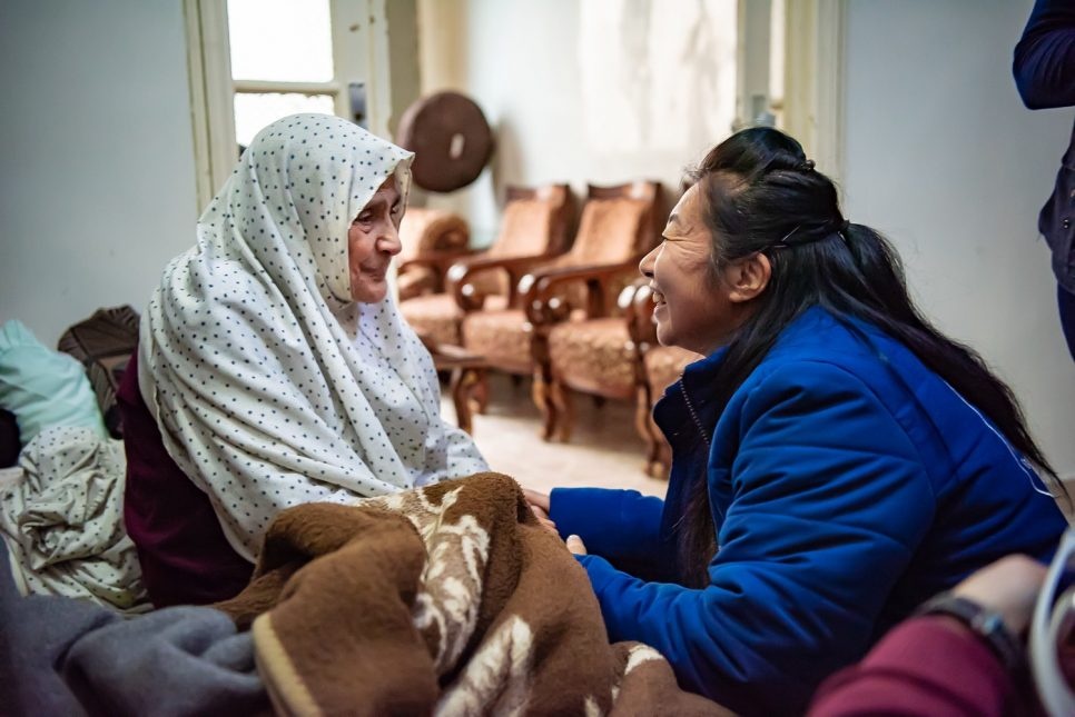Yumiko Takashima ontmoet de zevenjarige Subhi, die visueel gehandicapt is, in Aleppo, Syrië. © UNHCR/Antwan Chnkdji