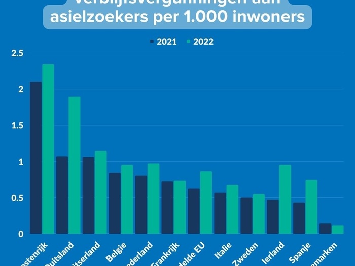 Is het waar dat Nederland meer asielzoekers een vluchtelingenstatus verleent dan buurlanden? Om een dergelijke vergelijking te maken moeten we kijken naar hoeveel asielvergunningen Nederland en andere EU/EFTA-landen hebben verleend per hoofd van de bevolking. In 2022 heeft Nederland bijna één vergunning verleend per 1.000 inwoners. Hiermee staat Nederland achter Oostenrijk (2,3), Duitsland (1,9) en Zwitserland (1,1) en gelijk met België. Bovendien zit Nederland niet ver af van het gemiddeld aantal verleende vergunning van alle EU-landen per hoofd van de bevolking (0,86), dichtbij Frankrijk en Italië.