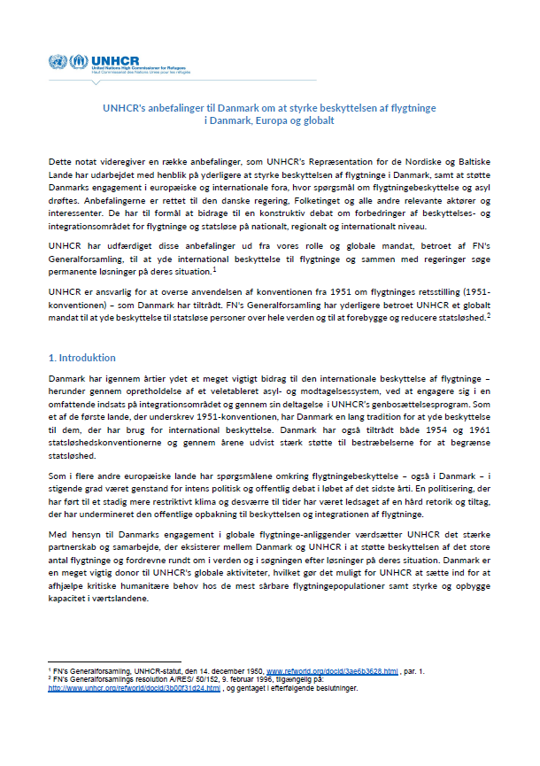 UNHCR's Repræsentation for de Nordiske og Baltiske Lande har udarbejdet et dokument, der beskriver UNHCR's synspunkter og anbefalinger til, hvordan beskyttelsen af flygtninge i Danmark kan styrkes yderligere, samt give input til Danmarks engagement i europæiske og internationale fora, hvor spørgsmål om flygtningebeskyttelse og asyl drøftes.