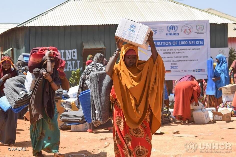 April 2022. Somalia. UNHCR distribuerer nødhjælpsforsyninger til internt fordrevne ramt af tørken i Baidoa.