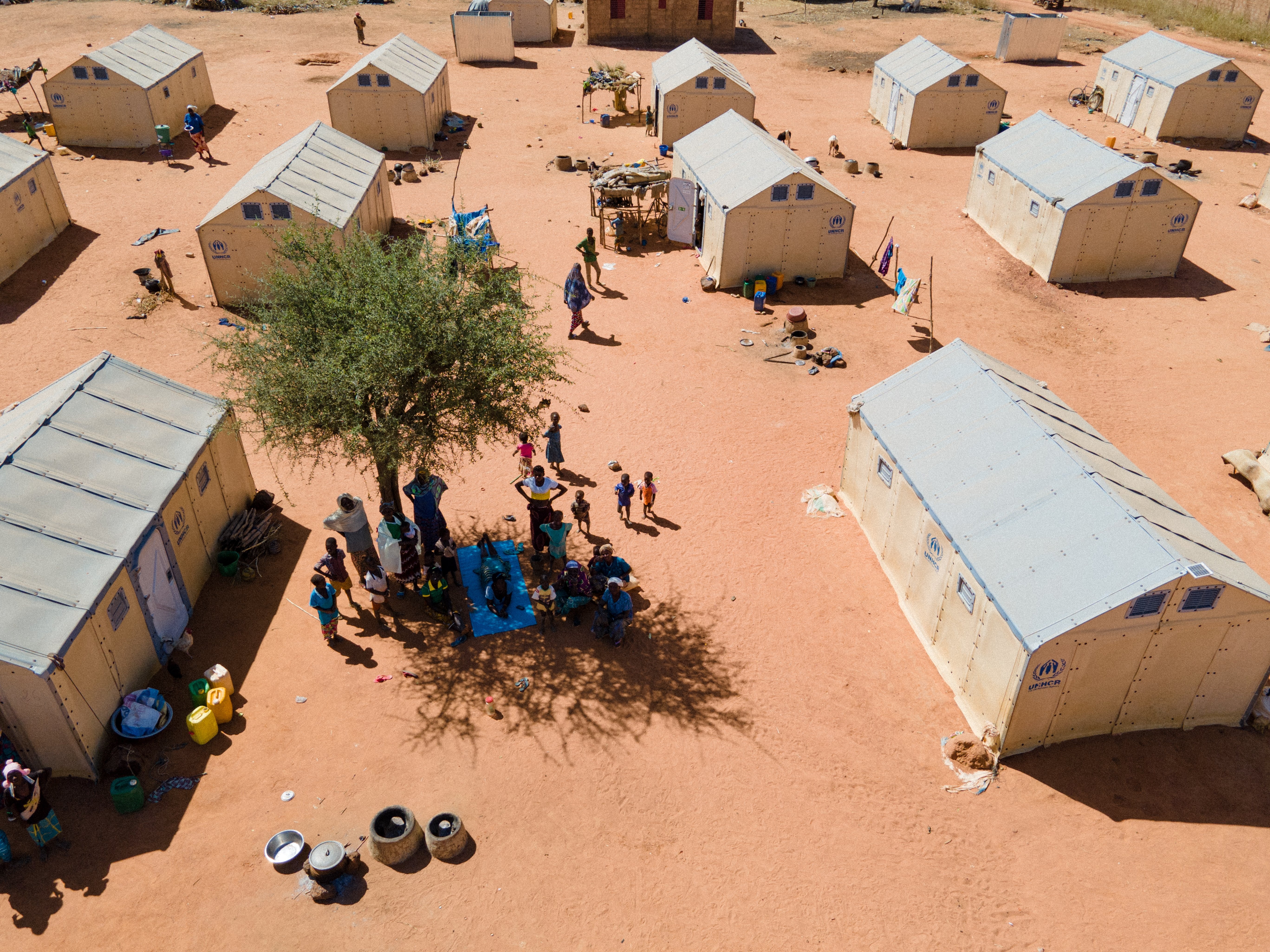 Internt fordrevne familier søger ly fra solen i skyggen af et træ udenfor deres UNHCR shelters i en lejr ved Kongoussi i Burkina Faso. © UNHCR/Anne Mimault