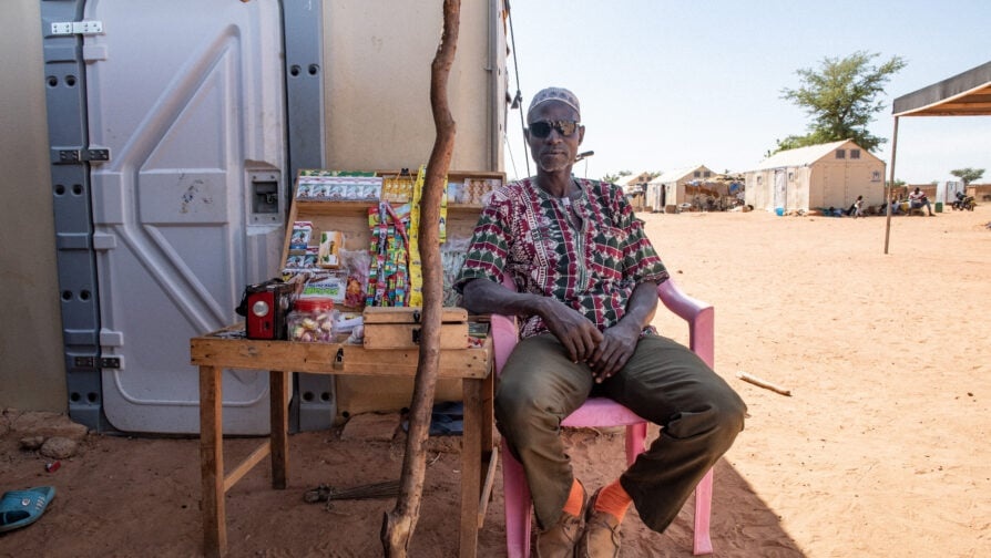 Sambo Maiga sælger forskellige varer foran sit shelter i den lejr for internt fordrevne personer i Kongoussi, hvor han og familien har søgt tilflugt. © UNHCR/Anne Mimault