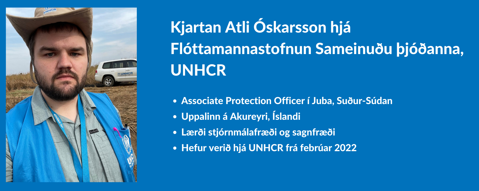 „Starfssvið mitt frá því að ég byrjaði hér hefur verið mjög fjölbreytt og hef ég fengið að skyggnast inn í mörg hlutverk hér hjá UNHCR. Í dag starfa ég sem teymisstjóri í teymi sem einbeitir sér að fólki sem er á flótta innan eigin lands. Meira en 2.2 milljónir manna eru á vergangi innan Suður-Súdan. Sá flótti stafar bæði af átökum og loftslagsbreytingum, sér í lagi flóðum. Suður-Súdan er í framlínu loftslagsvárinnar og glíma daglega við afleiðingar loftslagsbreytinga. Staðan í Suður-Súdan er þar af leiðandi erfið í ljósi þess að landið hefur valdið litlum skerf loftslagsbreytinga en ber hvað mestan kostnað þegar að kemur að afleiðingum þeirra.