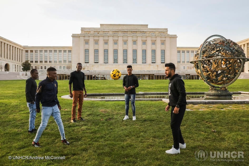 A refugee boxer with dreams of competing at the Tokyo2020 Olympics threw flurries of punches as he shadow boxed at the Palais des Nations, while others played football outside.