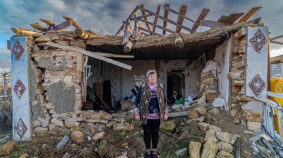 Valentyna Zavadska, 64, outside the remains of her house near Mykolaiv, which was destroyed by artillery in March 2022. She received support from UNHCR's local NGO partner to refurbish an adjoining building in which to live. © Sverige för UNHCR/Felicia Monteverde Holmgren