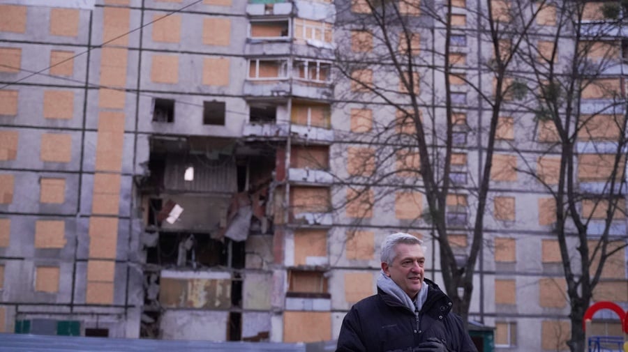 UN High Commissioner for Refugees Filippo Grandi visits one of 14 multi-story residential buildings damaged during an aerial attack on the city of Kharkiv in October 2024. © UNHCR/Oleksii Barkov