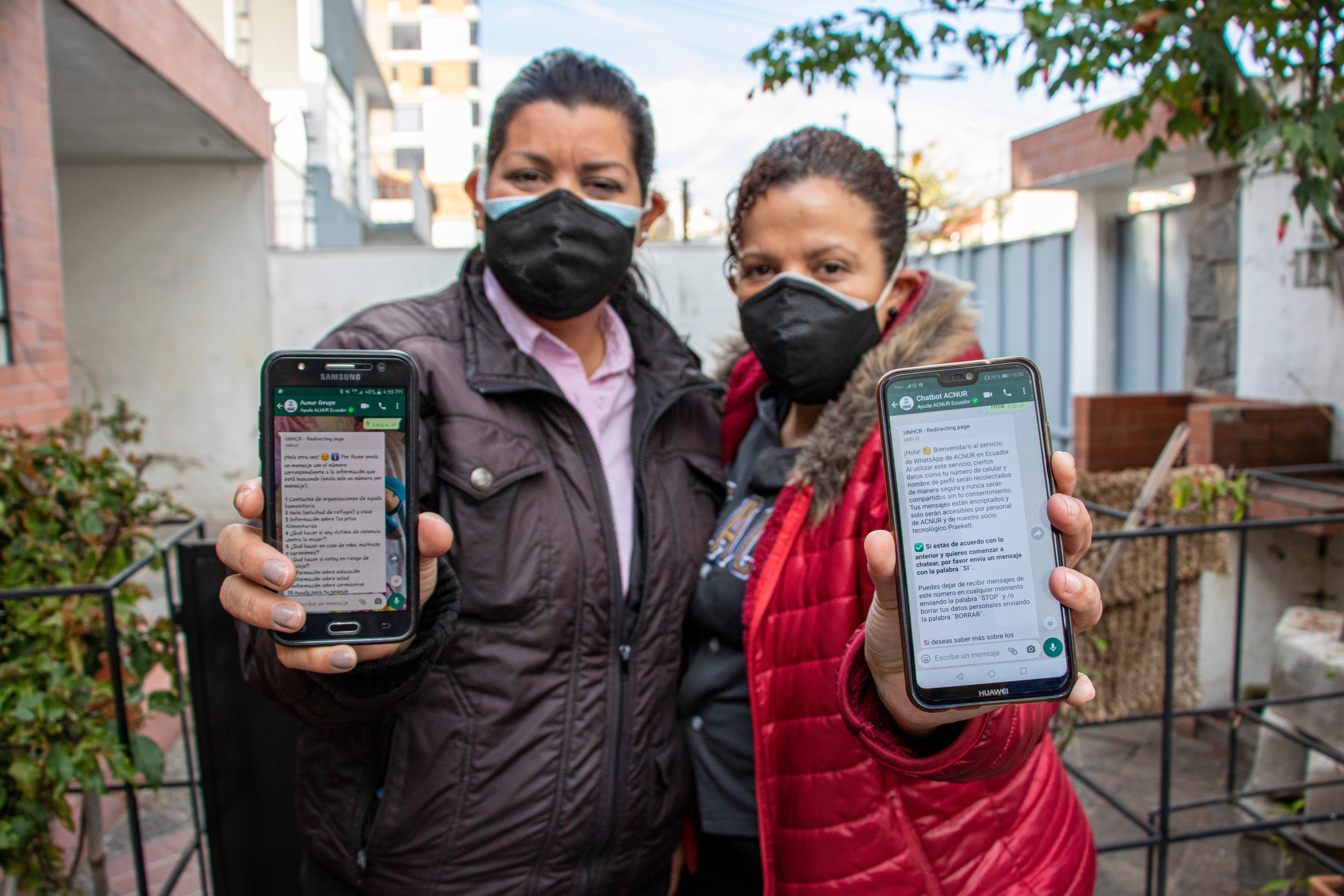 Lailet Chávez and Yeraldine Cabrera, Venezuelan LGBTI refugees, practice using the new UNHCR WhatsApp channel, during a workshop in Quito, Ecuador. UNHCR in Ecuador has created a digital tool that allows refugees to access relevant content through WhatsApp. © UNHCR/Jaime Giménez
