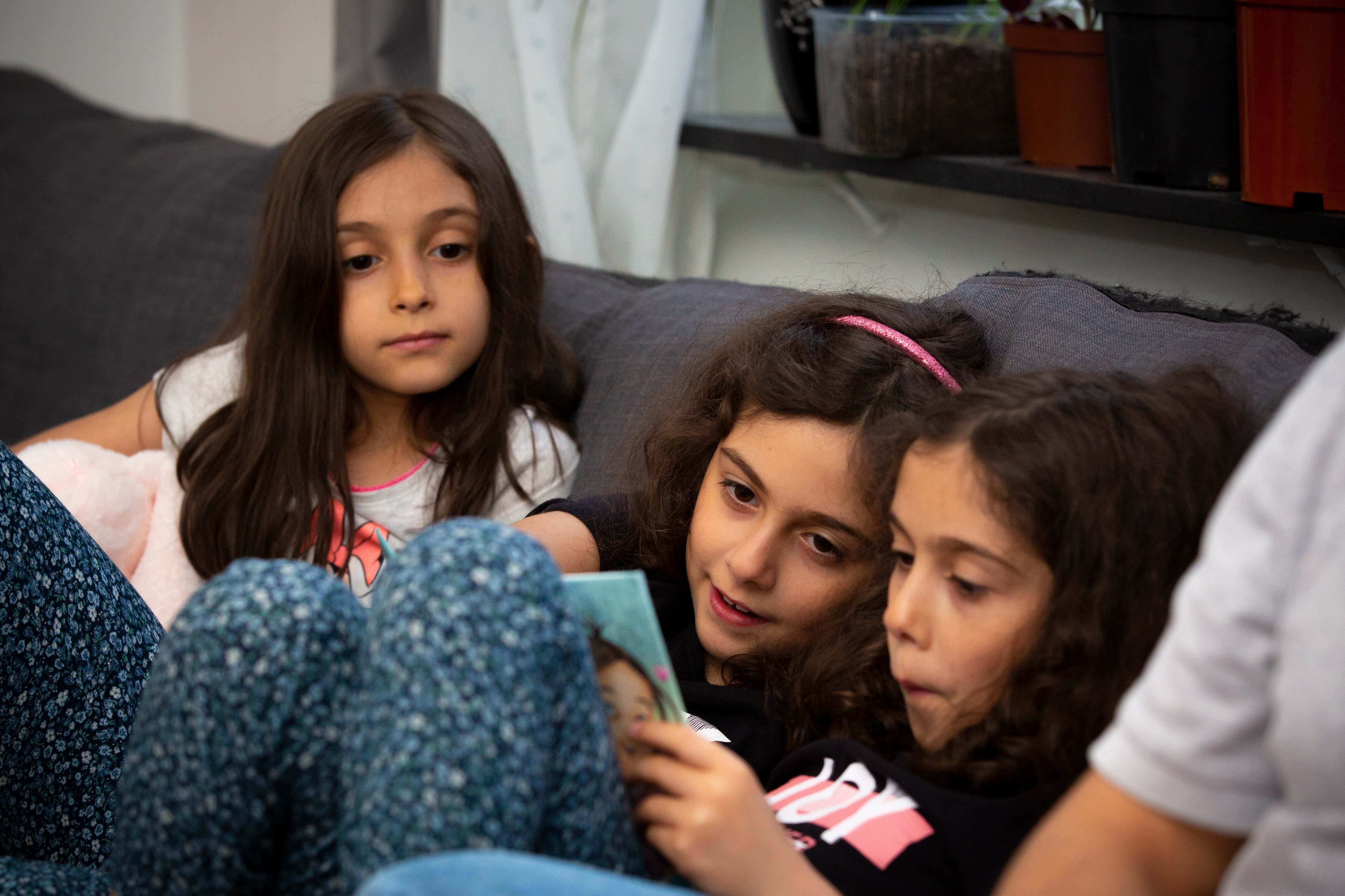 Daughters Sara, Amina and Youmna read one of the children\'s books that their dad Ali has translated. © Max-Michel Kolijn