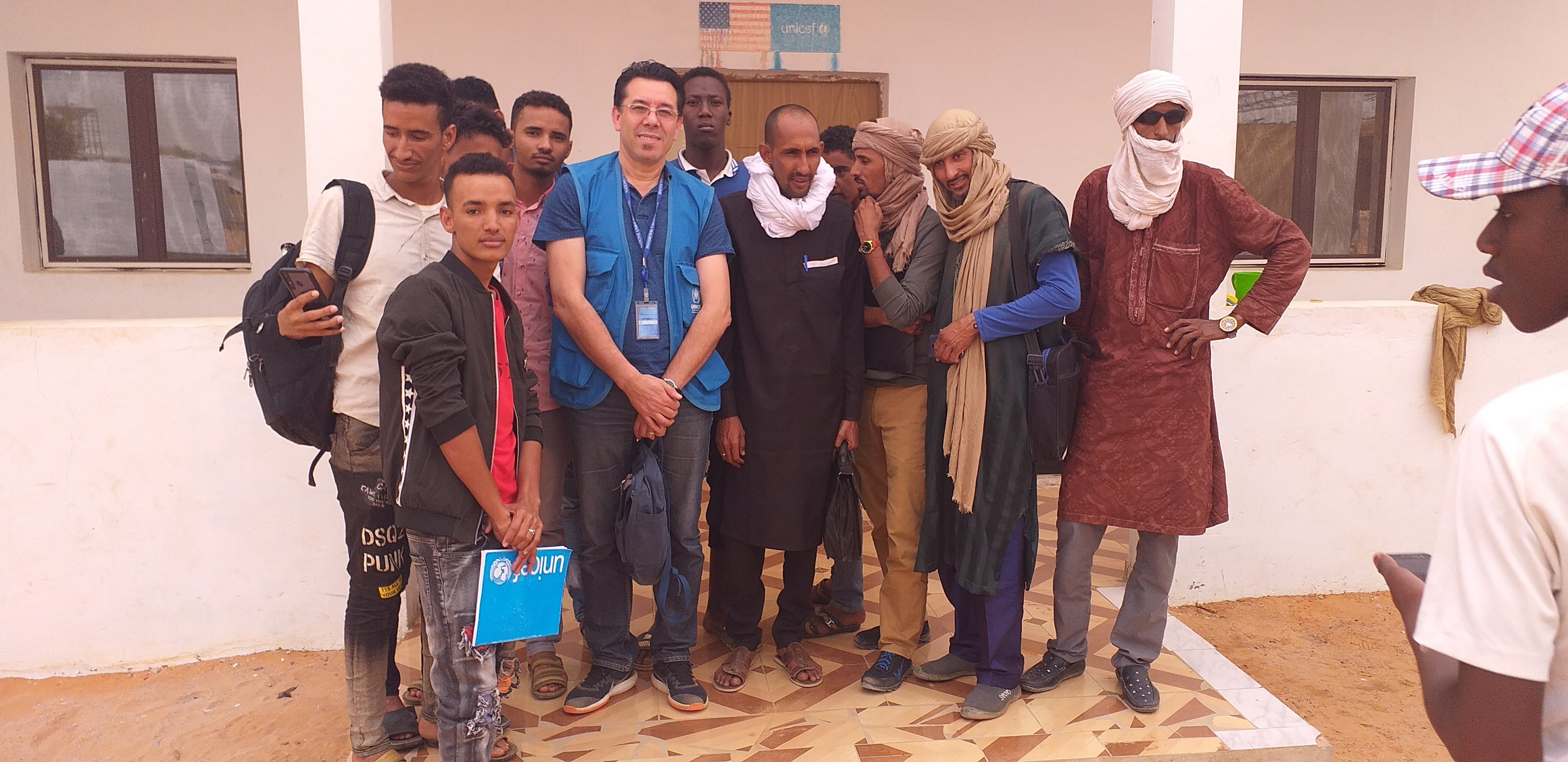 Gabriel El Khili with youth from Mberra Camp, Mauritania.