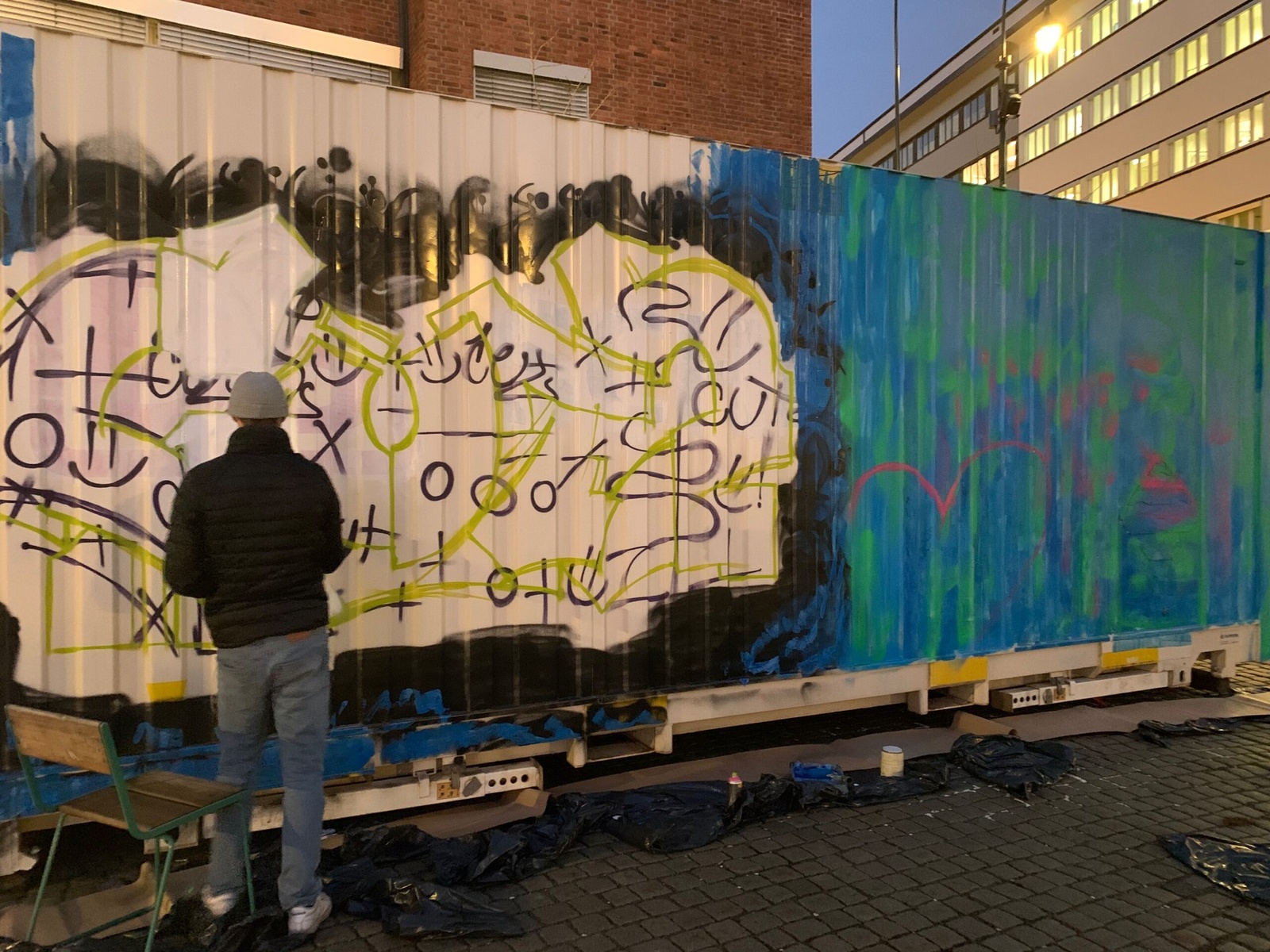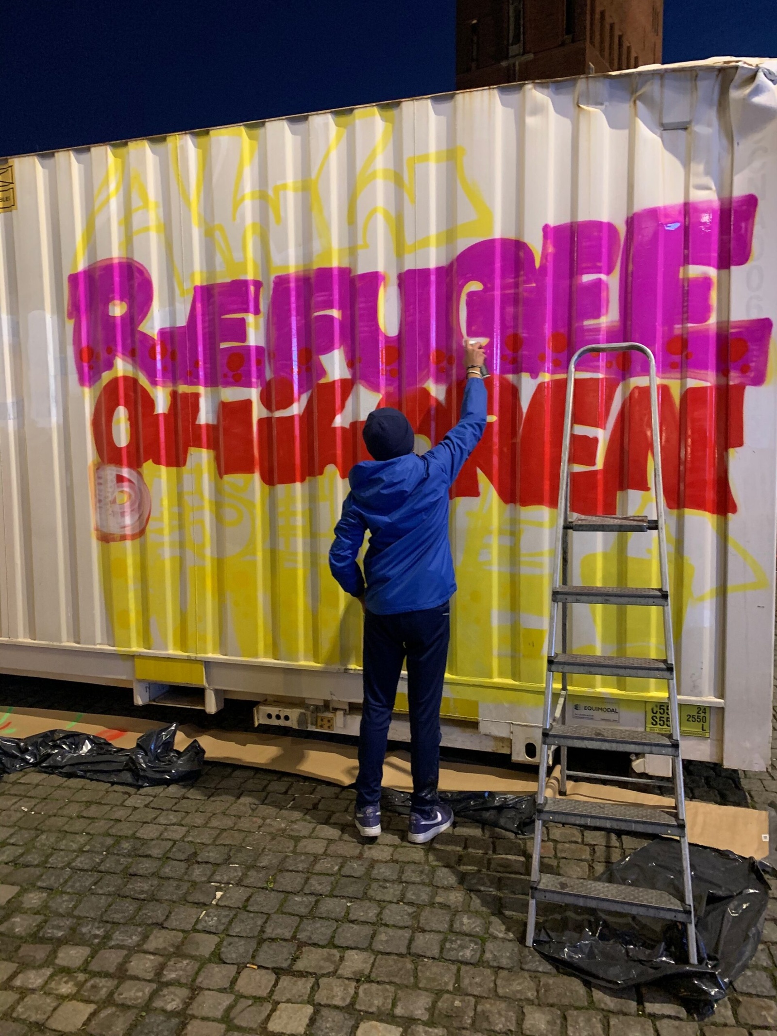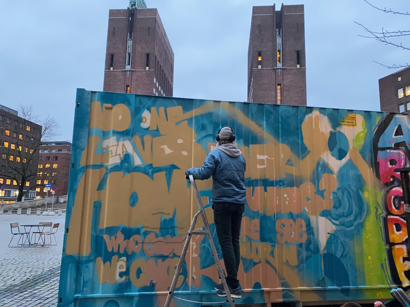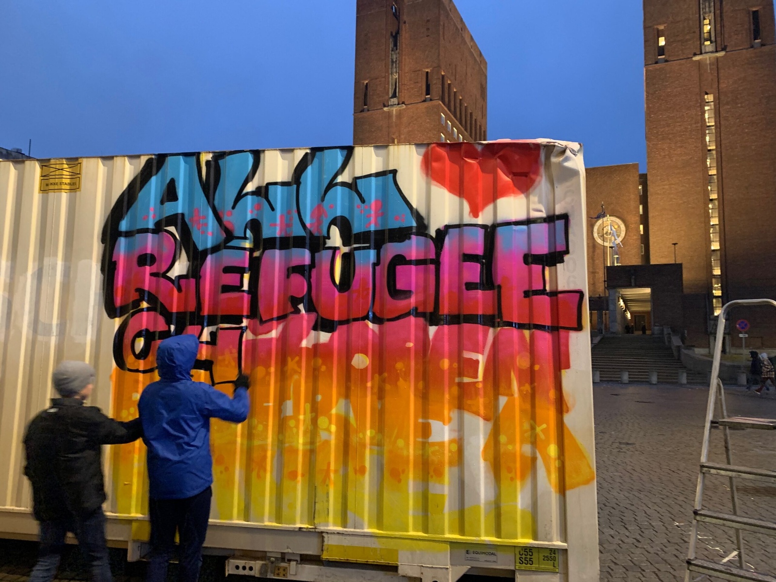 Malingen av containeren på Fridtjof Nansens plass vil starte opp den 1. desember og kan følges på direkten de påfølgende dagene. Gjennom å jobbe pro bono, viser graffitikunstnerne sin støtte til flyktningbarn, og bidrar med sterke og kreative visulle uttrykk som underbygger arbeidet til FN-organisasjonene.