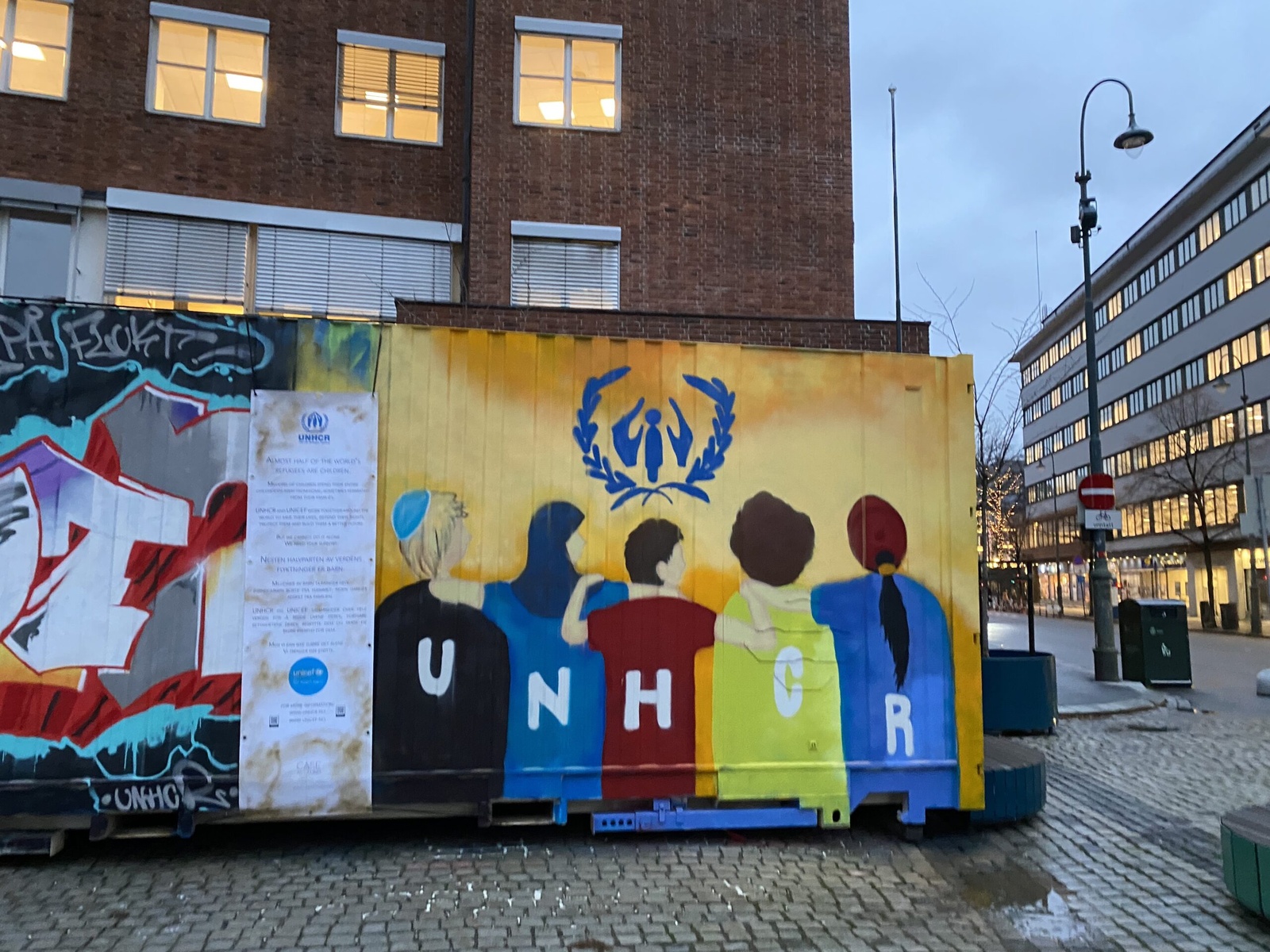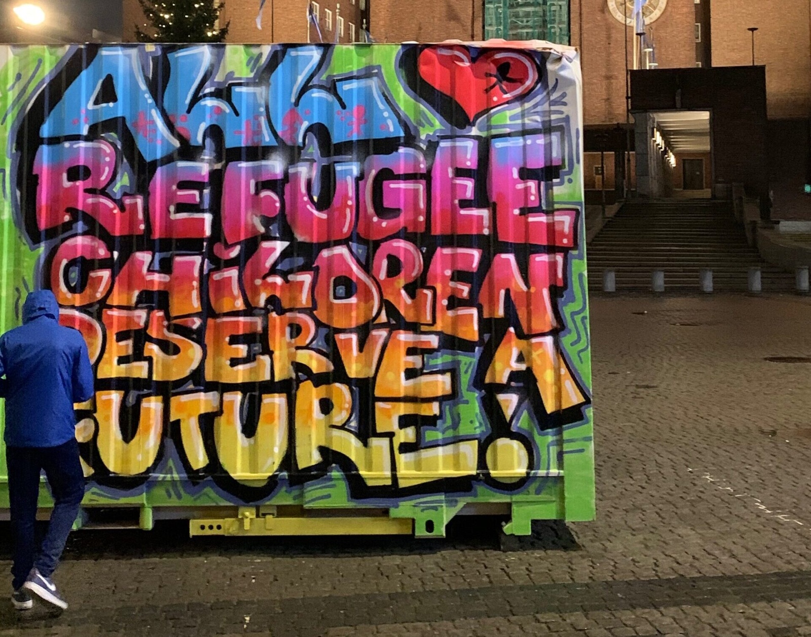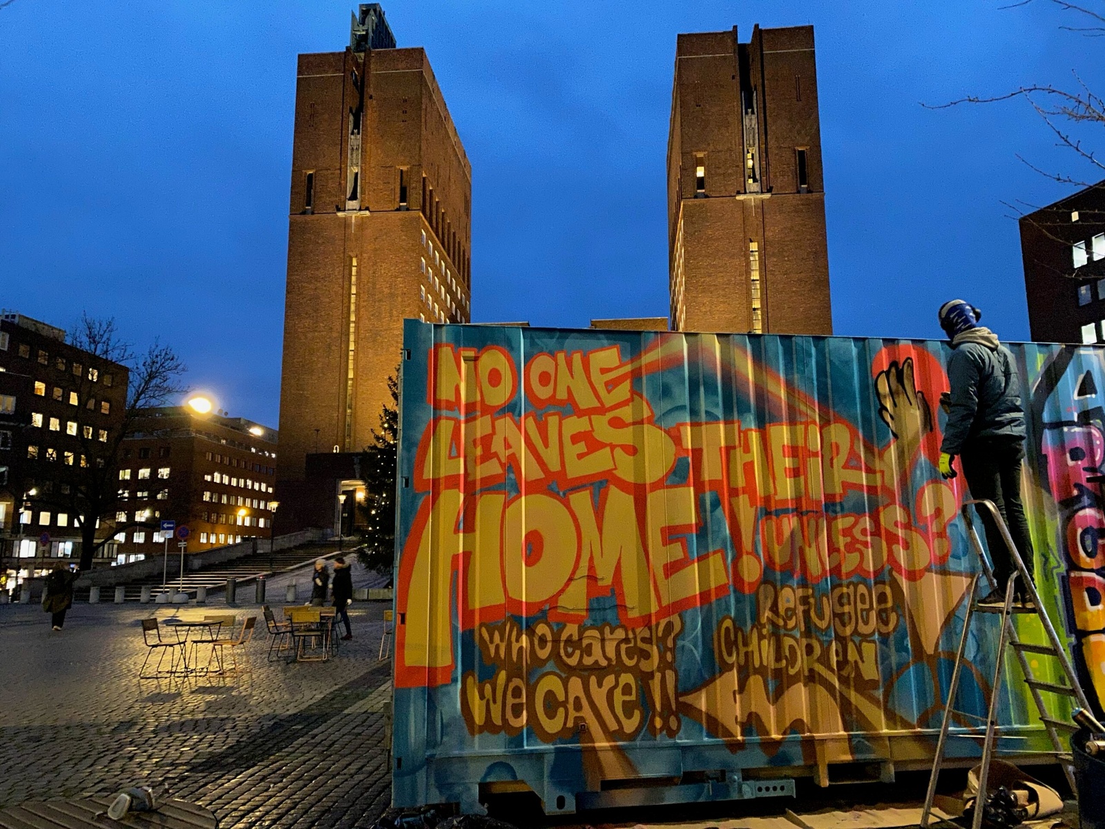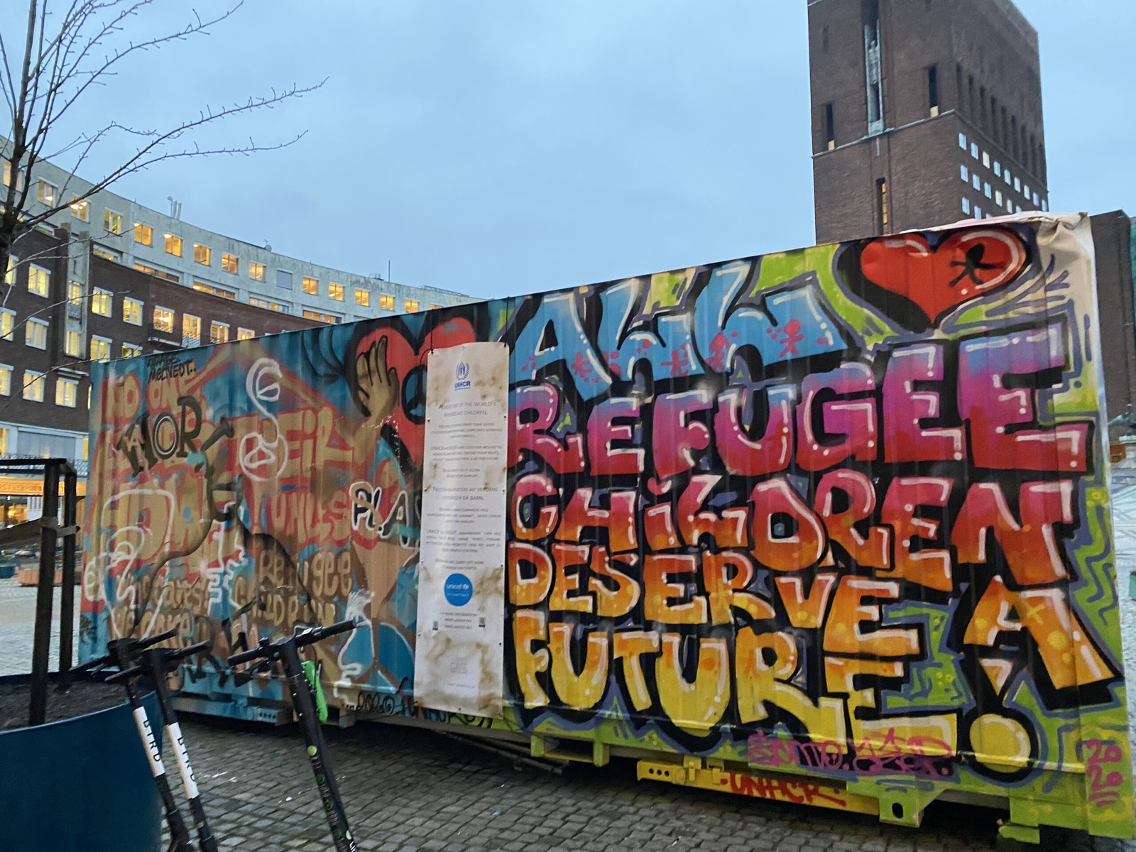 Fra og med i dag, og gjennom hele desember og januar kan alle som går forbi Fridtjof Nansens plass ved Rådhuset i Oslo oppdage en graffitimalt container i flunkende farger. Den er plassert der av UNHCR, FNs flyktningorganisasjon, og UNICEF, FNs barnefond, som sammen ønsker å skape økt oppmerksomhet omkring det store antallet barn i verden som har blitt tvunget til å flykte fra sine hjem.