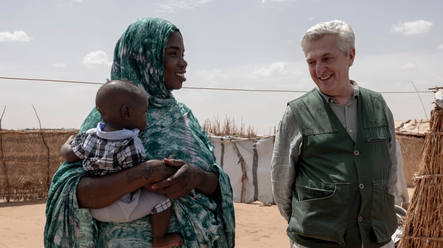 UNHCR:s högkommissarie Filippo Grandi träffar sudanesiska flyktingfamiljer som bor i ett läger i Adré, vid gränsen mellan Tchad och Sudan, under sitt senaste besök i Tchad i april 2025. © UNHCR/Nicolo Filippo Rosso.