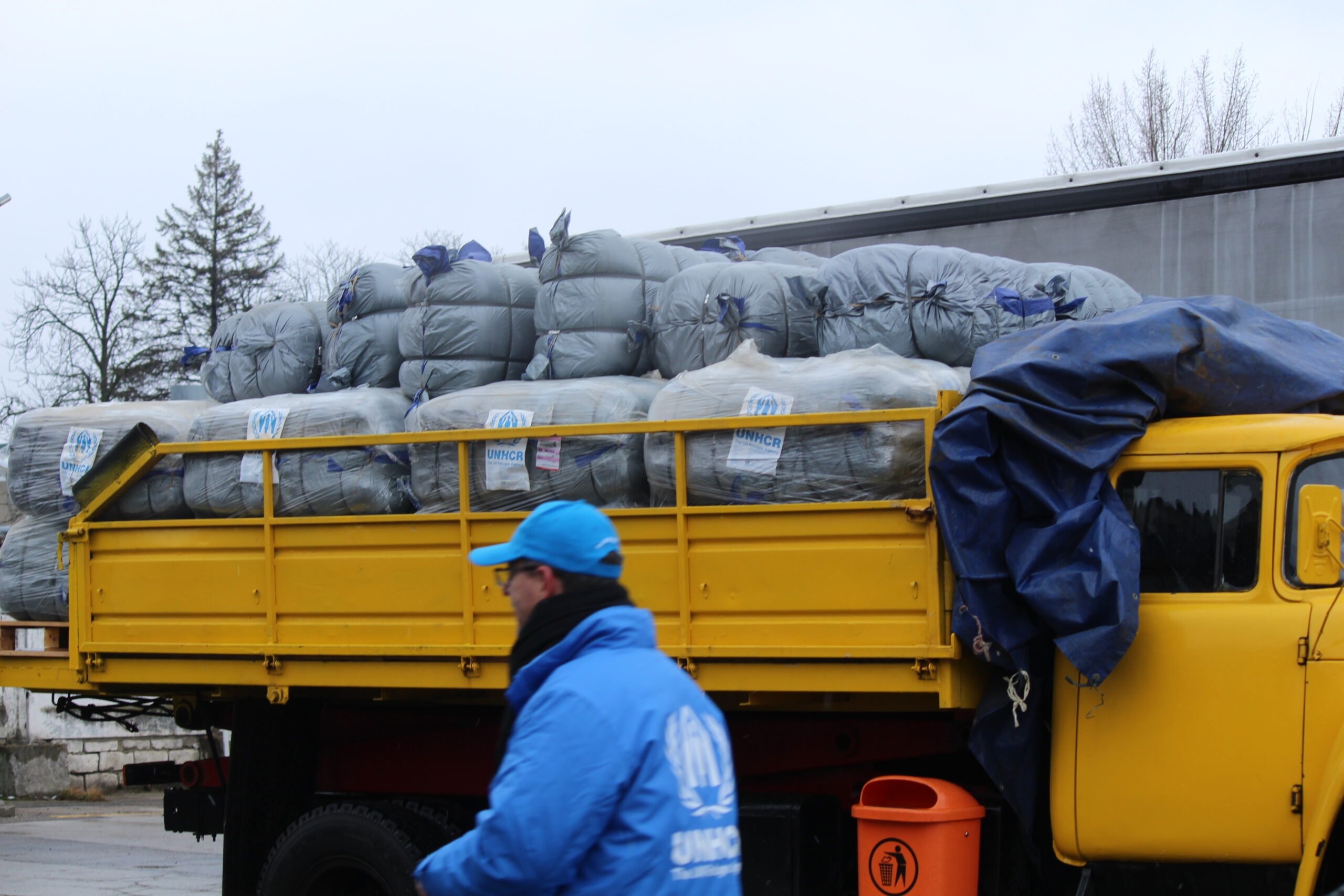 förnödenheter som filtar, hygienartiklar, vatten och vinterkläder till människor på flykt i Ukraina. ©UNHCR/Anatol Matasaru" />