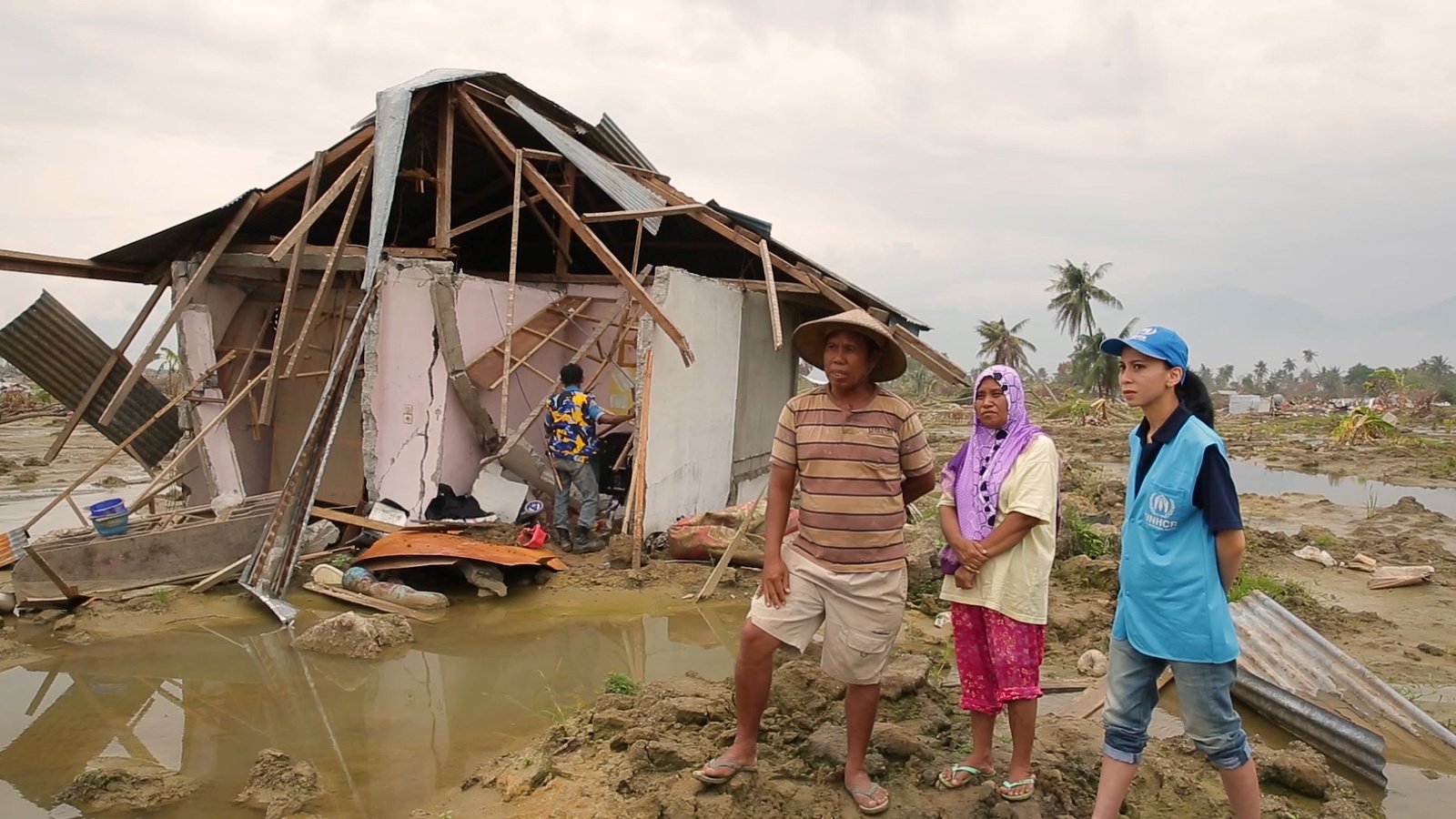 UNHCR staff meet with Bampek and his family, who survived the earthquake in Sulawesi.