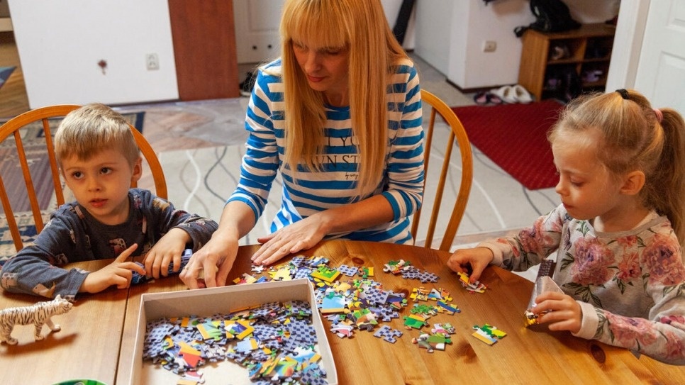 Today, the family lives in an apartment in the southern city of Krakow where Darya’s son Artyom, 4, and daughter Anastasiia, 6, attend a local government school, while Darya has found work at a car parts factory.