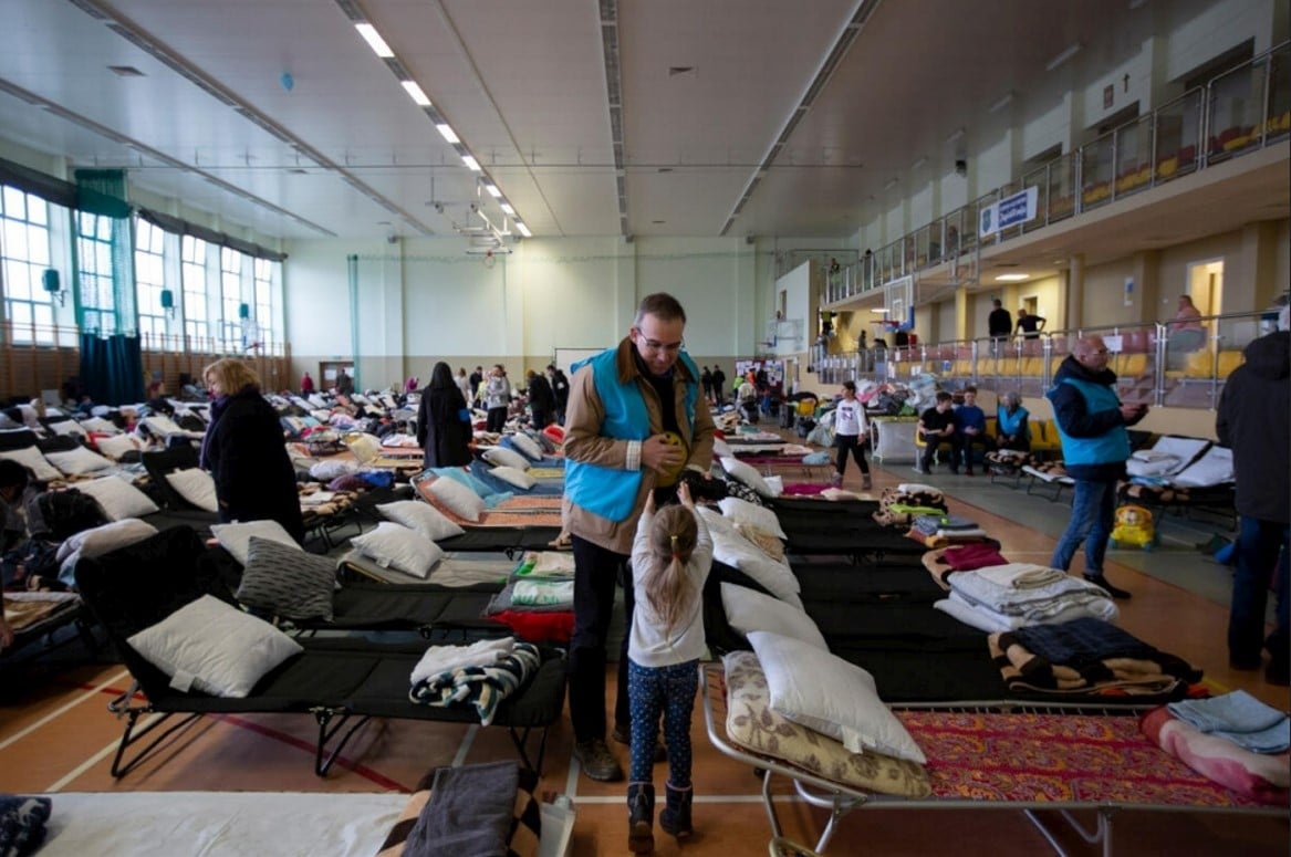 Ośrodek recepcyjny w Medyce został utworzony w budynku hali sportowej, żeby dać tymczasowe schronienie uchodźcom z Ukrainy. © UNHCR/Valerio Muscella