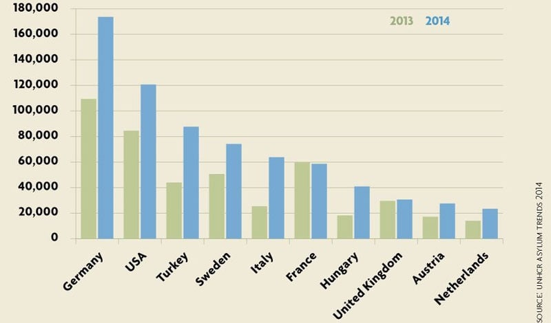 Na liście krajów pochodzenia osób ubiegających się o nadanie statusu uchodźcy prowadzą: Syria (48400 wniosków), Irak (21300) oraz Afganistan (19300).