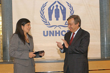 Katrine Camilleri accepts the Nansen medal from High Commissioner António Guterres.