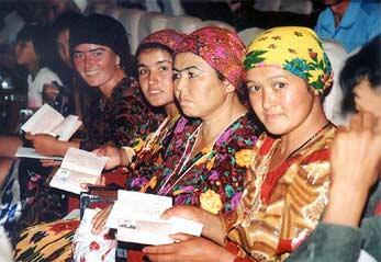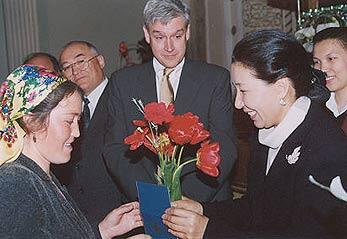 Kyrgyzstan's First Lady, Professor Mairam Akaeva, handing out passports to Tajik refugees in a ceremony in April.