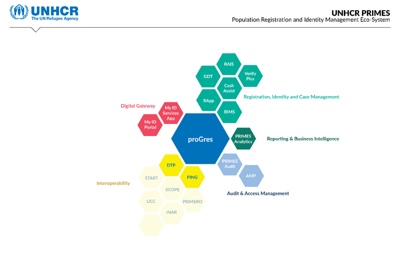 proGres enables UNHCR to grant access to partners, including host Governments, ensuring a common platform for collaboration and it is interoperable with other corporate tools such as RApp, BIMS, CashAssist, GDT, PRIMES Analytics, Digital Gateway, PING, PRIMES Audit and AMP.