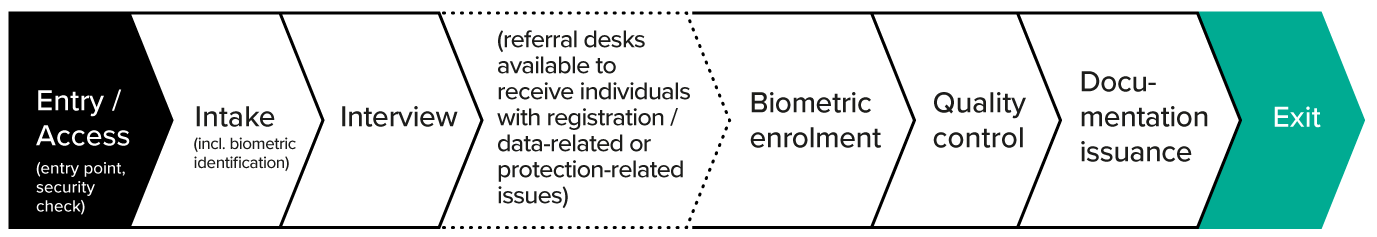 Additional steps may be added to the standard process flow as required. For example, additional referral desks to adjudicate data issues, nationality verification or address other issues, health examination or vaccination stations, distribution of relief supplies or shelter materials, or any other context-specific requirement. See Module 3.5 “Key steps in the process flow” for guidance on the above process flow steps. Note also, depending on several factors including the scale of the registration activity, it can sometimes be more efficient to split the interview and biometrics steps.