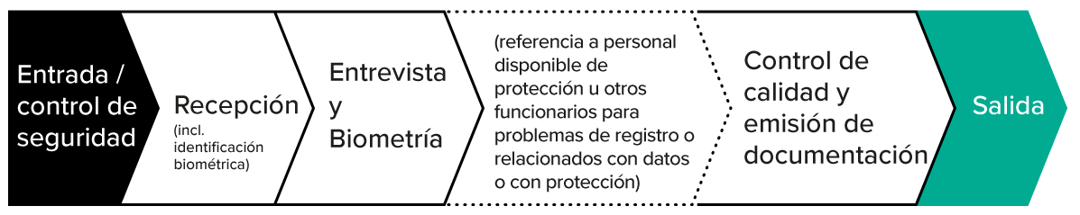 El flujo de proceso se refiere a las etapas en el proceso de la actividad de registro, dependiendo de los objetivos de la actividad de registro y la metodología de procesamiento elegida. Un flujo de proceso inicial típico en un campamento de refugiados podría incluir las siguientes etapas: