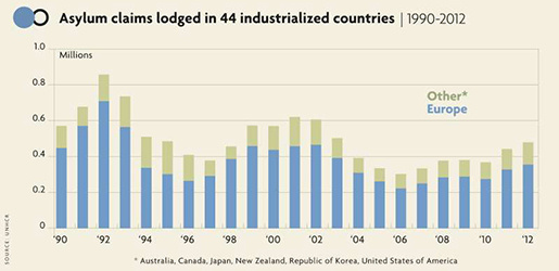 Conflicte nou apărute sau mai vechi, inclusiv cele din Siria, Afganistan, Irak şi Somalia, au contribuit în anul 2012 la o creştere cu 8% a numărului de solicitări de azil înregistrat în ţările industrializate, cea mai însemnată creştere înregistrând numărul de numărul de solicitări depuse de cetăţeni sirieni.