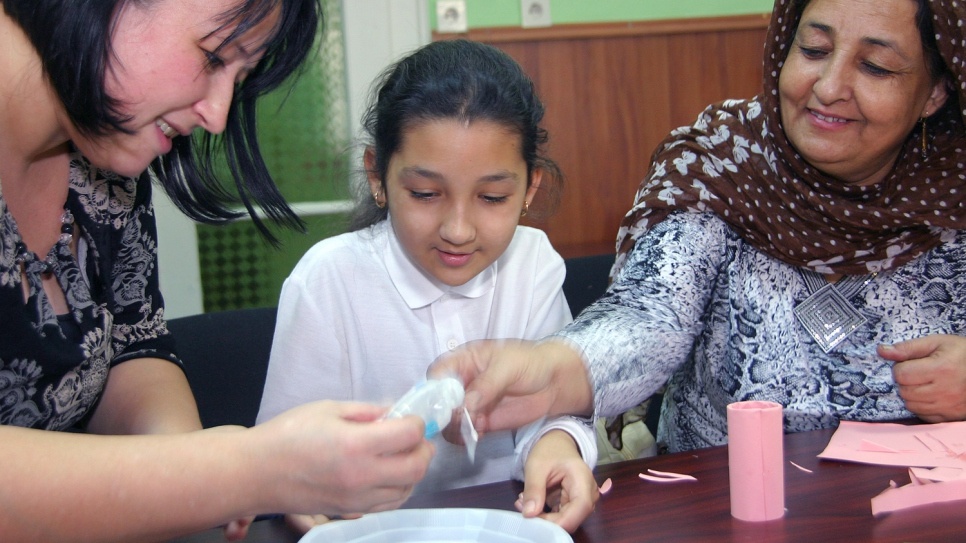 La casa AIDRom, refugiații cu copii mici se bucură de o după-amiază creativă alături de Simona Ilioni-Loga, psiholog și terapeut prin artă. Folosind role de hârtie igienică și hârtie colorată, confecționează animale, cum ar fi iepuri, pinguini și arici.