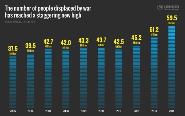 UNHCR's new annual Global Trends report shows a sharp escalation in the number of people forced to flee their homes, with 59.5 million people forcibly displaced at the end of 2014 compared to 51.2 million a year earlier and 37.5 million a decade ago. The increase since 2013 was the highest ever seen in a single year.