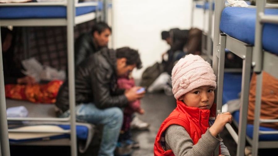 A little girl play around in the tent set up at One Stop Center in the town of Sid, Serbia on January 8, 2016. Number of Refugees on the Balkan route on their way to western European countries despite deteriorating weather conditions is still measured by thousands arriving in Serbia every day. The refugees are being transferred from Sid by train directly to Reception Center in Slavonski Brod, Croatia about 100 kilometers away. While waiting for a train refugees are based in warm tents at One Stop Center near train station where they can get medical attention, food and water supplies, warm clothes and boots. According to weather forecast snow and freezing temperatures can be expected again at mid of January.