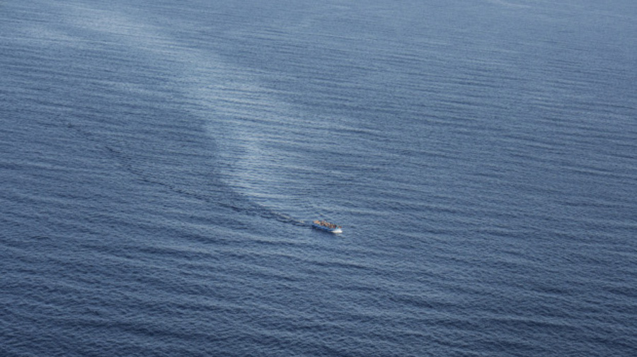A stranded boat filled with people is seen from the helicopter of a Search and Rescue team of Mare Nostrum. ; With Summer at its peak and the waves at their calmest, Italy's Mare Nostrum Rescue at Sea operation has been inundated with arrivals of asylum seekers, mostly journeying from the coast of Libya. At least 5000 were rescued at sea over the course of just 48 hours between June 28 - 29, 2014. Given the large number of arrivals, all within hours, the Military Ship San Giorgio that normally acts as a collecting vessel for those already rescued, had to conduct direct rescues itself. Photographer Alfredo D'Amato was on board and captured the rescue process from identification of boats by the Italian Air Force to the rescue of the four boatfuls of people and disembarkation at Taranto in Puglia. With a total of 1171 from four different rescued boats, the group comprised 820 men, 148 women and 174 accompanied and 29 unaccompanied minors. Over fifty percent of those rescued were Syrians, mostly families and large groups. The total number of families were 100, including some from Eritrea and Sudan. Pakistan (100 men), Bangladesh (70 men and 2 UASM), Gambia, Somalia, Nigeria, Mali, Benin, Ghana, Senegal, Guinea Bissau, Ivory Coast, Morocco and Tunisia were the other nationalities that arrived. Three men from Libya, who were amongst those saved, were arrested under charges of trafficking/smuggling. Given the sharp increase in arrivals ver 2014, Italy has repeatedly asked for help from the EU and sharing the burden of the operation that costs Euros 8 Million per month. Since the operation started in October 2014, 73,686 people have been rescued while in distress at sea. Considered EU's largest such mission to date, Italy's decision to launch Mare Nostrum was a direct response to the more than 350 lives lost during twin shipwrecks off the coast of Lampedusa in October 2013.