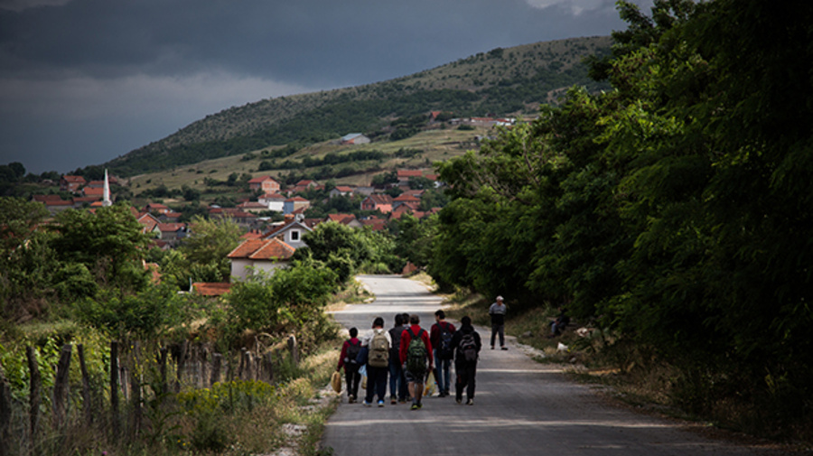 A group of Syrian refugees walk towards the town of Lojane after being pushed back from the Serbia border my Serbian authorities, in Lojane, Macedonia.