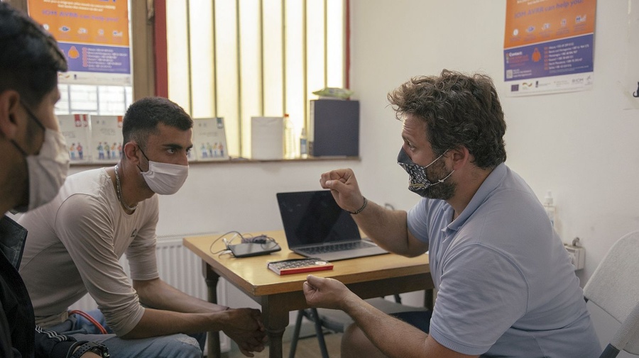 Nikola Kovačević razgovara sa avganistanskim izbeglicama u Prihvatnom centru Adaševci© UNHCR-Vladimir Živojinović