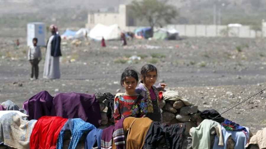 Internally displaced children (Right to left) Muna,9, and Swkina,8, stand outside their family tent after the family fled their home in Saada province and found refuge in Darawan camp in the northern province of Amran. ;